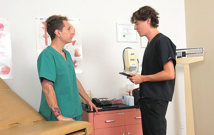 The doctor was going over his records and noticed he hadn’t seen one of the patients’ lab results, so Andy was called back into the exam room and gave the Doctor the updated lab tests. It was time for their lunch break, unlike last time, the of them ever made it to lunch. Andy suggested they get some lunch, and the Doctor indicated he was so hungry and wanted to have an appetizer first when he went in and started kissing Andy on the lips.