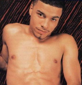On a violet bed, with a low black headboard of posts, Mike (black NY baseball cap) sucks Antoine (black do-rag under black cap, mustache and goatee, oblong tag on a neck chain, right wristband, 2 tiny tattoos on right deltoid); Antoine sucks, rims, and tops Mike (black NY baseball cap).